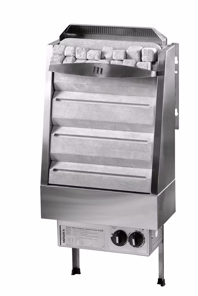 Mondex, suomalainen avainlipputuote on turvallinen valinta joka saunaan. Classic Steelin tyylikäs pelkistetty sileä kivipinta tuo saunaasi suoraviivaista ulkonäköä. Käyttökytkimien kätisyys vaihdettavissa vasemmalle, oikealle tai eteen. Mondex Classic Steel 6,0 kW kiukaan suositeltava saunan koko on 5-8 m3. Päälläoloaika 0-4 h ja ennakkoajastin maks. 8 h. Suojaetäisyys palavaan materiaaliin edessä 30 cm, sivuilla 7 cm. Voidaan asentaa suoraan paneeliseinään. Huomioikaa kiukaan mitoituksessa eristämättömät pinnat sekä lasipinnat ja ikkunat. Nämä kasvattavat kiukaan tehontarvetta.