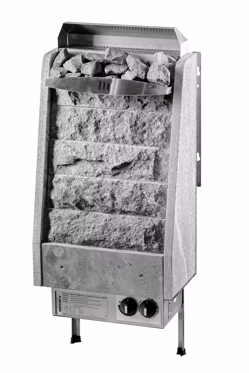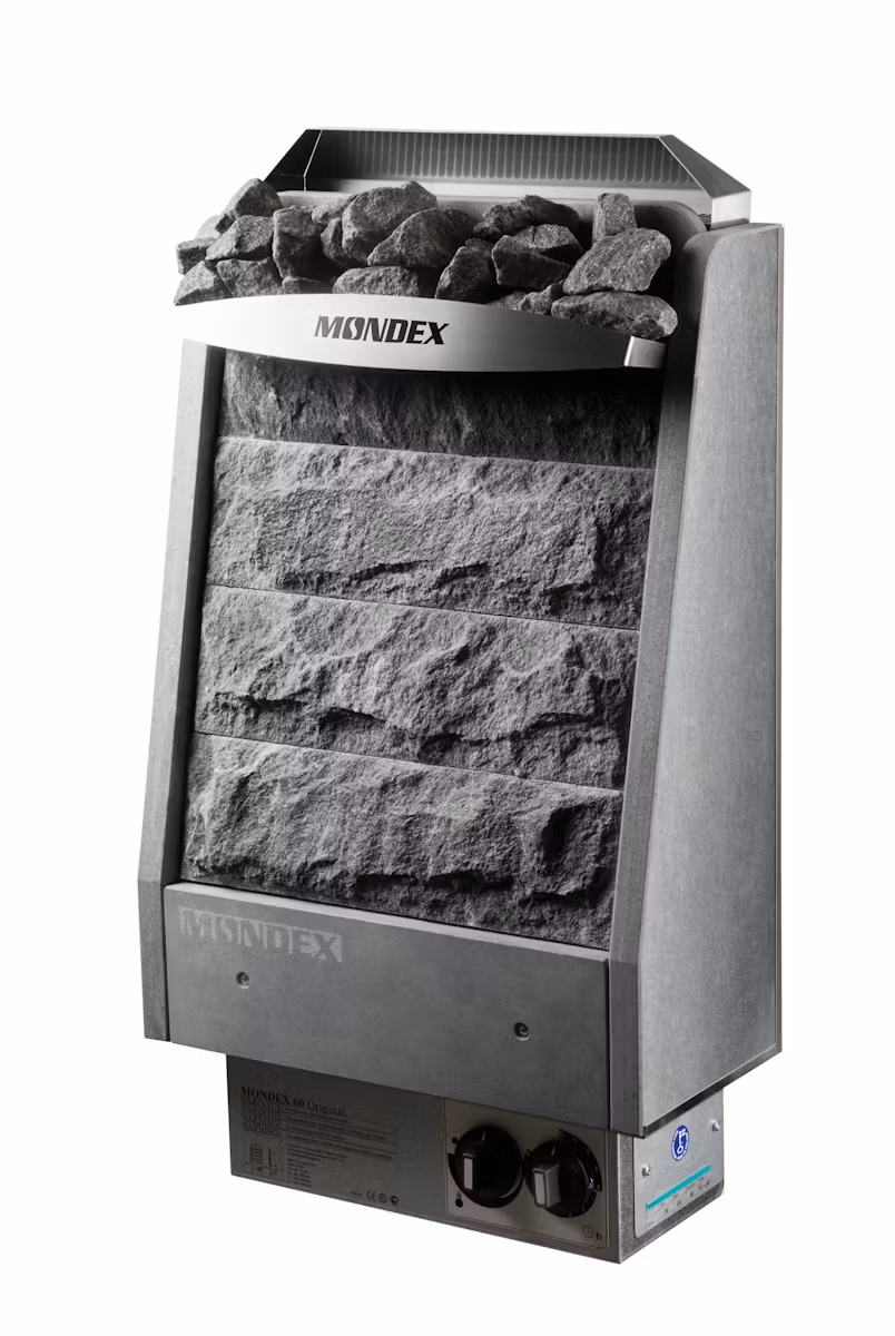 Mondex, suomalainen avainlipputuote on turvallinen valinta joka saunaan. Lohkottu kivipinta antaa karhean aidon kiven tunnetta saunaan. Myös kiukaan sivu- alaosat on valmistettu vuolukivestä. Käyttökytkimien kätisyys vaihdettavissa vasemmalle, oikealle tai eteen. Mondex Classic Lohko 6,0 kW kiukaan suositeltava saunan koko on 5-8 m3. Päälläoloaika 0-4 h ja ennakkoajastin maks. 8 h. Suojaetäisyys palavaan materiaaliin edessä 30 cm, sivuilla 7 cm. Voidaan asentaa suoraan paneeliseinään. Huomioikaa kiukaan mitoituksessa eristämättömät pinnat sekä lasipinnat ja ikkunat. Nämä kasvattavat kiukaan tehontarvetta.