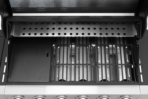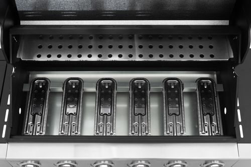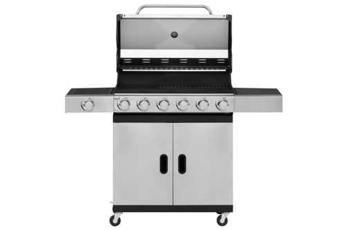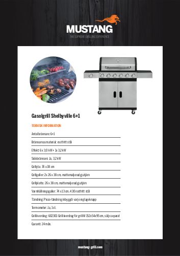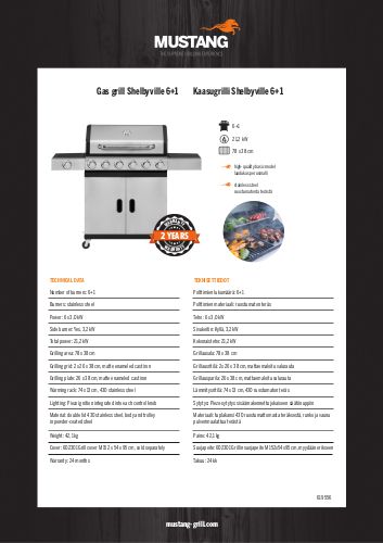 Kuuden polttimen kaasugrilli sivukeittimellä. Pääpolttimien teho 6 x 3,0 kW. Sivukeitin 3,2 kW. Kokonaisteho 21,2 kW. Polttimet valmistettu ruostumattomasta teräksestä. Grillausala 78 x 38 cm, joka on jaettu 2 kpl valurautaritilän 26 x 38 cm ja 1 kpl valurautaparilan 26 x 38 cm kesken. Ritilä ja parila mattaemaloitua valurautaa. Lämmitysritilä 74 x 13 cm, 430 ruostumattomasta teräksestä. Grillin tuplakansi 430 ruostumattomasta teräksestä, runko ja vaunu pulverimaalattua terästä. 4 kpl lämmönjakopeltejä aluminoitua peltiä. Rasvapelti grillin alla. Säilytyskaappi tarvikkeille. 2 pientä ja 2 lukittavaa pientä pyörää helpottavat grillin siirtelyä. Mustang lämpömittari. Sopiva suojapeite 602301. Takuu 2 vuotta.