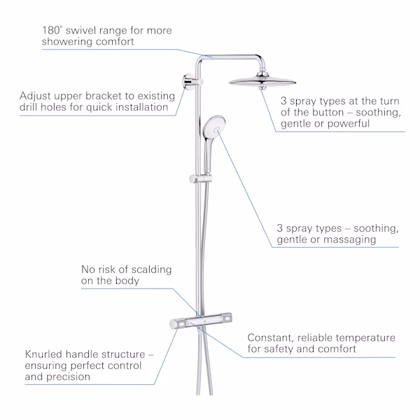 Grohe Euphoria 260 System -suihkujärjestelmä ammetermostaatilla seinäasennukseen. Kun asetat haluamasi veden lämpötilan GROHE TurboStat -toiminnon avulla, lämpötila pysyy vakaana, vaikka syöttövedessä ilmenisi vaihteluita. GROHE EcoJoy pienentää vedenkulutusta mutta takaa täydellisen suihkunautinnon. Helppokäyttöinen GROHE SafeStop -ominaisuus rajoittaa veden lämpötilan korkeintaan 38 asteeseen – näin lapset voivat peseytyä itsenäisesti turvallisesti ja aikuiset voivat nostaa lämpötilaa halutessaan. GROHE DreamSpray huolehtii siitä, että vettä virtaa jokaisesta suuttimesta tasaisesti. Kätevät silikoniset SpeedClean-suuttimet on helppo pitää puhtaina ja kalkittomina. GROHE Starlight -pinnoite on poikkeuksellisen kestävä ja säilyttää ulkonäkönsä vuosia. GROHE CoolTouch avulla vältät palovammariskin. Sisäänrakennettu WaterGuide pidentää suihkun käyttöikää.