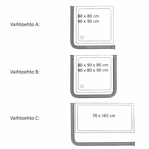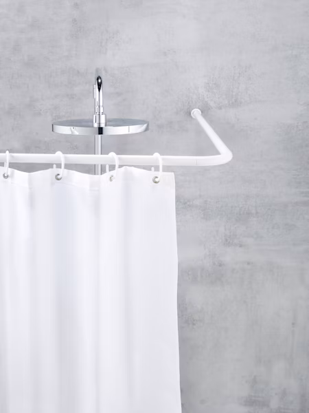 Tue kulmasuihkuverhotanko kattoon kiinni kätevällä kattotuella. Kattotuen pituus on 57 cm. Tanko kiinnitetään kattoon ruuveilla. Paketissa on ruuvit ja tulpat mukana. Suihkuverhotangon tuki on valmistettu alumiinista ja se on väriltään valkoinen.