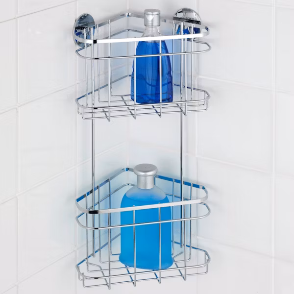 Tämä ruostumattomasta teräksestä valmistettu suihkukori on hyvä valinta etenkin silloin, jos saippua- ja shamppoopullot ovat näyttäviä ja korkeita. Korkeareunaisessa suihkukorissa pullot pysyvät hyvin pystyssä. Kaksiosainen suihkukulmahylly tuo tuplasti säilytystilaa kylpyhuoneeseen. Korimallin ansiosta saippuajämät eivät sotke hyllyä, vaan saippuavedet huuhtoutuvat alas lattialle.