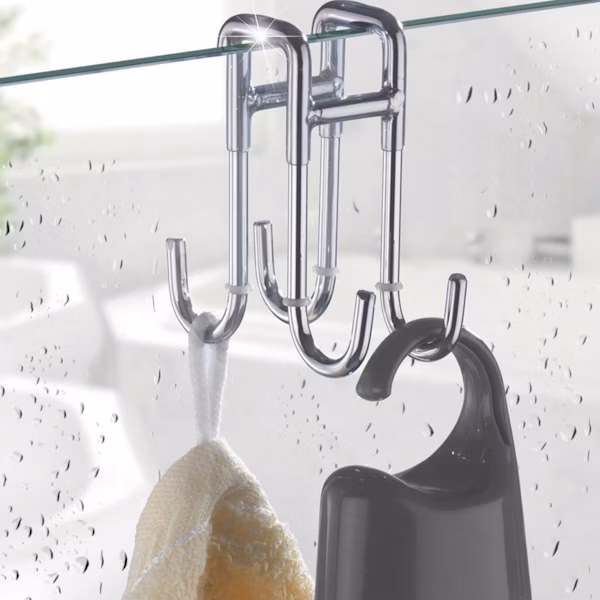 Suihkuseinään ripustettava tuplakoukku on kätevä tapa hankkia lisäsäilytystilaa kylpyhuoneeseen. Sen asentamiseen ei tarvita liimaa, tarroja tai työkaluja. Kiiltävä koukku ripustetaan yksinkertaisesti suihkuseinän päälle, jolloin molemmin puolin suihkuseinää on käytettävissä paikka esimerkiksi pyyhkeille ja pesusienille.