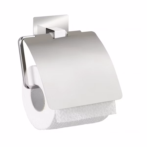 Ruostumattomasta teräksestä valmistettu kannellinen Wenko Quadro -WC-paperiteline on kestävä ja tyylikäs vaihtoehto. Se kiinnitetään seinään fiksun TurboLoc-kiinnityksen avulla.