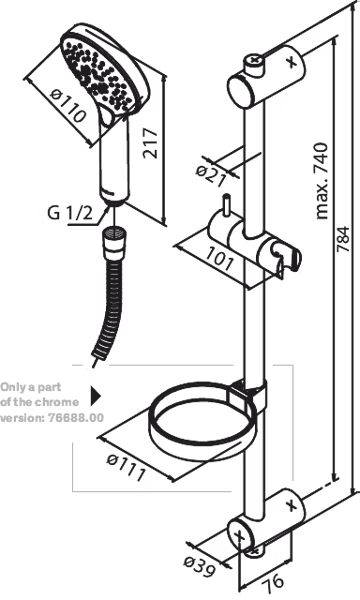 Suihkutangon pituus784 mm