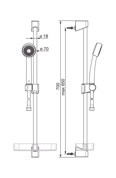 • suihkun osat: käsisuihku, suihkutanko, säädettävä suihkun kannatin, saippuateline, suihkuletku (1500 mm)